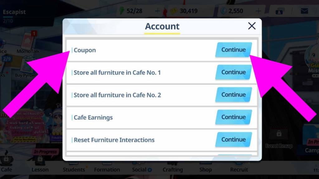 4. Gulir ke bawah sampai Anda melihat bagian kupon dan tekan tombol Lanjutkan di sebelahnya.