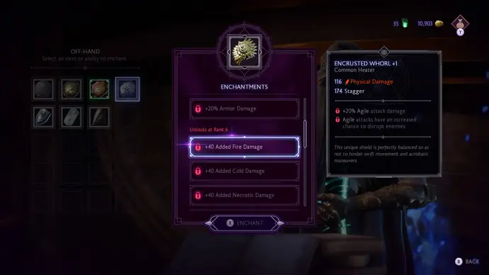Вы также захотите обратить внимание на свой щит, поскольку чемпионы могут использовать его. Инкрустированный whorl имеет хорошую физическую атаку, а также имеет высокий уровень ошеломления . Есть несколько щитов, которые применяют элементарный ущерб, поэтому вы можете рассмотреть защитник некрополиса на некротический ущерб, если вы хотите повысить в этой области.